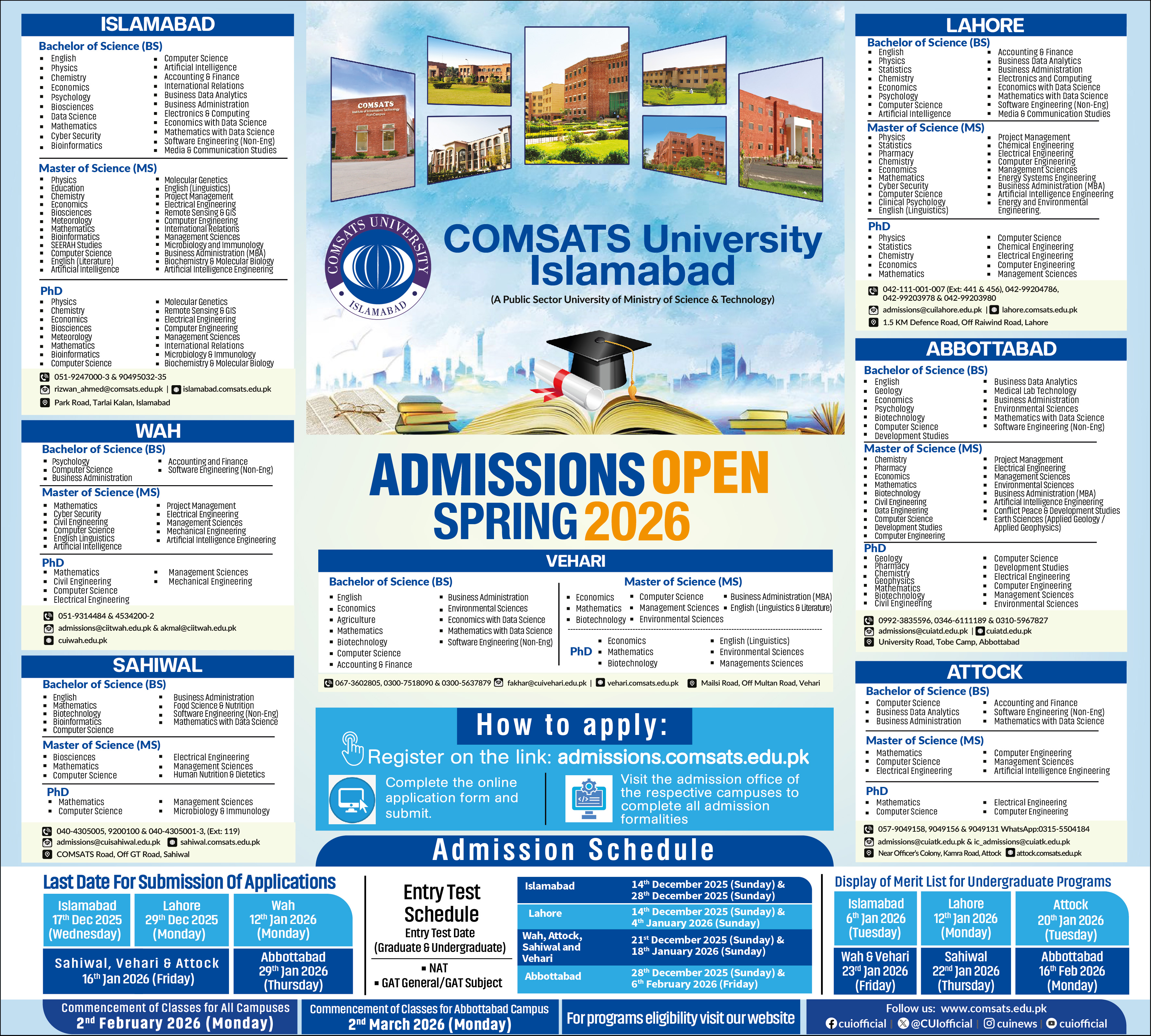 Admissions in CUI are granted on the basis of open merit amongst the eligible candidates subject to the availability of seats in each program.