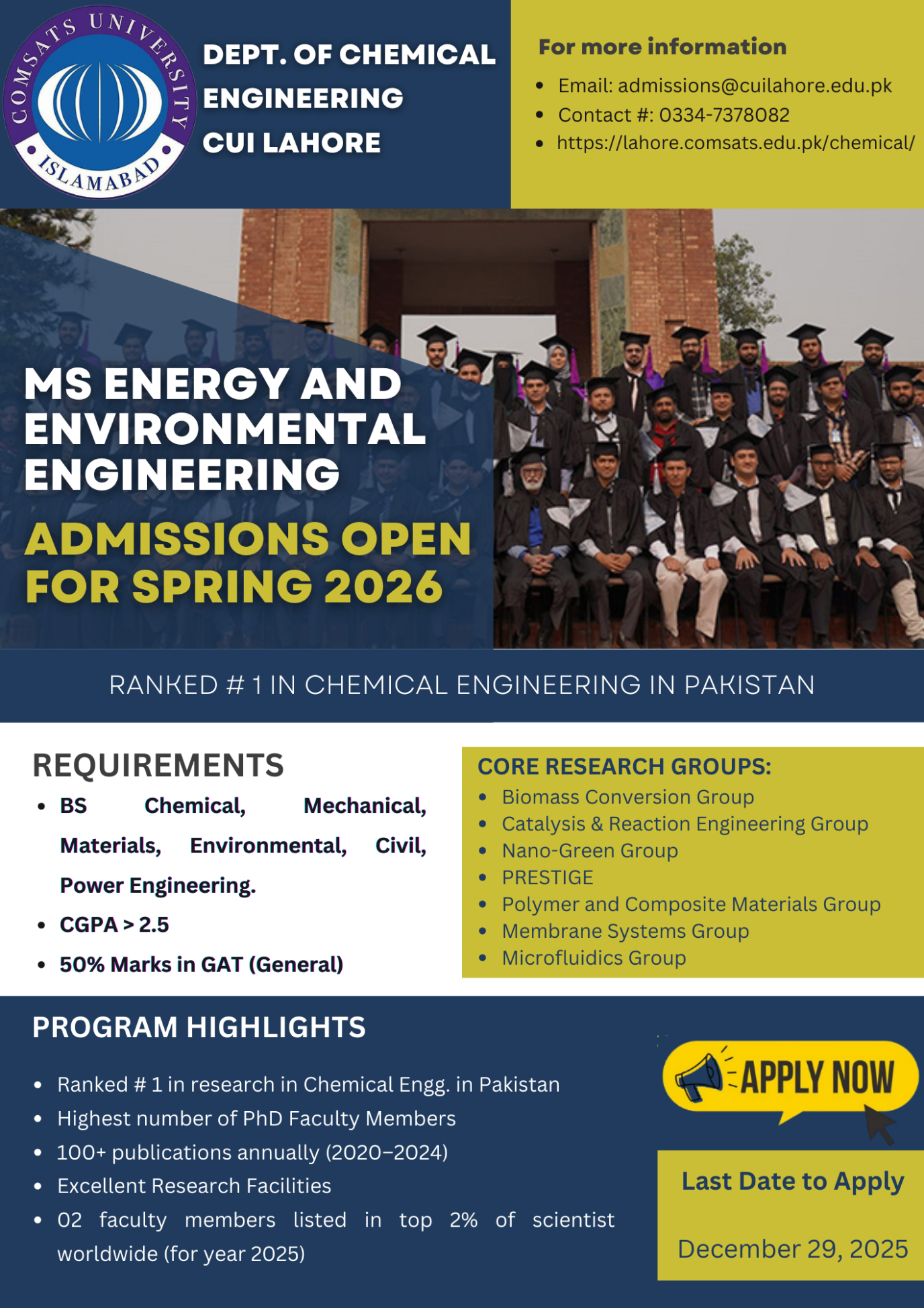 The Energy and Environmental Engineering program at COMSATS University is designed to provide students with the knowledge and skills necessary to meet the demands of the rapidly changing energy and environmental engineering field. Our emphasis on hands-on experience, cutting-edge research, and a solid foundation in the fundamental principles of energy and environmental engineering, ensures that our graduates are well-prepared to make a positive impact on the industry and the world. Additionally, the department has strong linkages with industries, which provides students with opportunities in industries to experience real-world experience. This helps to prepare students for successful careers after graduation and gives them an edge when entering the job market. Moreover, our department is affiliated with the American Institute of Chemical Engineers and provides students with a chance to participate in conferences, competitions, and events organized by the institute.