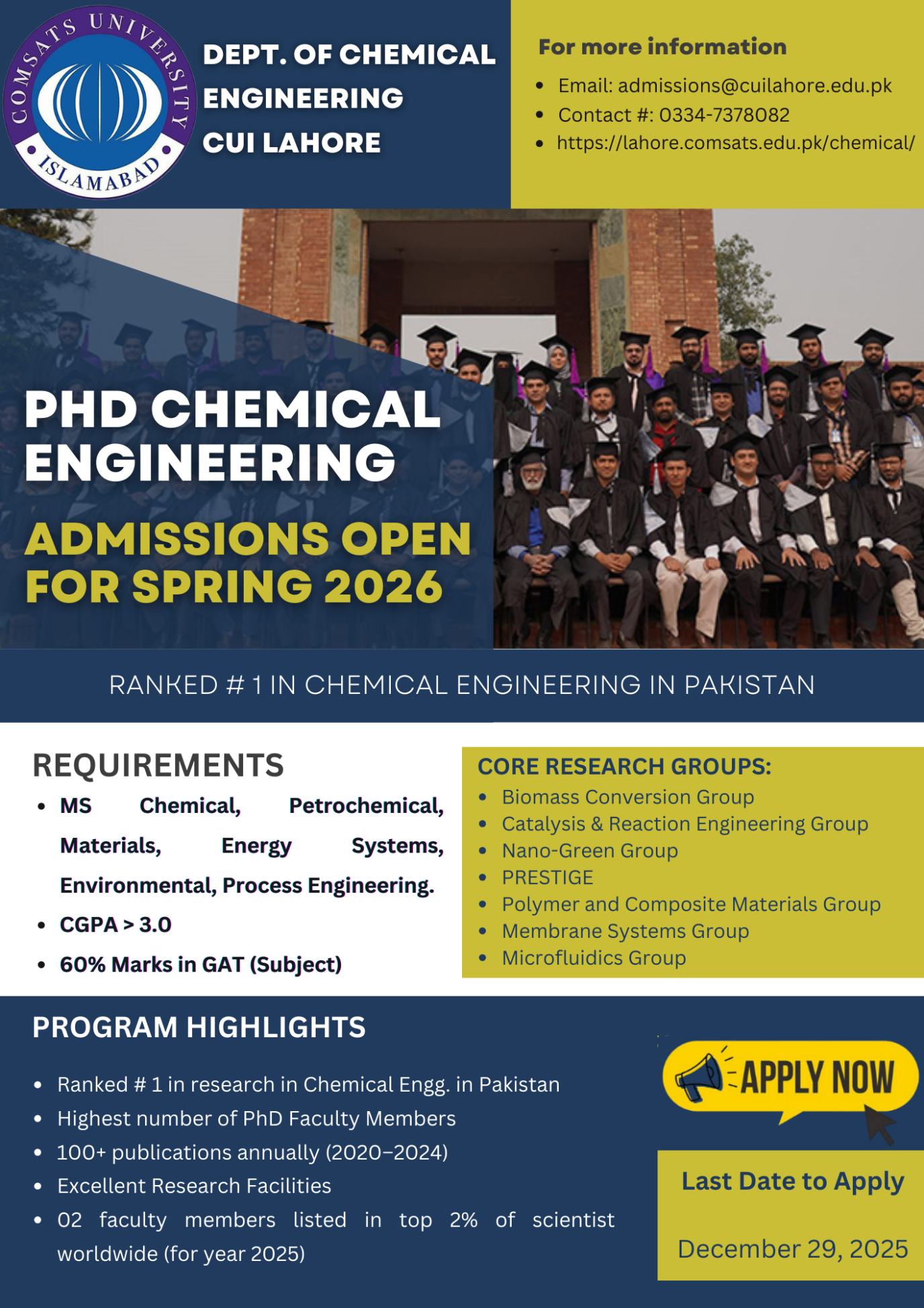 The Department of Chemical Engineering at COMSATS University offers a Doctor of Philosophy (PhD) in Chemical Engineering program that is designed to provide students with advanced education and research training in the field of chemical engineering. Our program is specifically tailored to provide students with the knowledge and skills necessary to conduct original research and make a significant contribution to the field of chemical engineering.